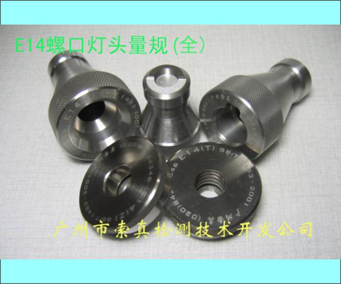 本公司设计制造的E14螺口式灯头量规,适用于E14螺口灯头的电光源灯泡的质量检测.其结构及有关波形(如螺纹波形)通过电脑的计算及优化,再通过电脑机床的加工,达到了高度的精密和美观.其材料采用防锈能力强的高硬质合金制造.最近,经技术攻关,量规的硬度更提高到 HRC=70~75 (GB及IEC要求: HRC=58~65),寿命提高3~4倍. 产品深受国内企业特别是合资企业的青睐,并开始远销台湾和欧洲。